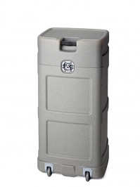 De travel is een verrijdbare trollytas waar de gehele wand in verpakt en vervoerd kan worden en de standard case is hiervan de hard-kunststof uitvoering die men dan ook tot balie kan omtoveren met zilverkleuring bovenblad.