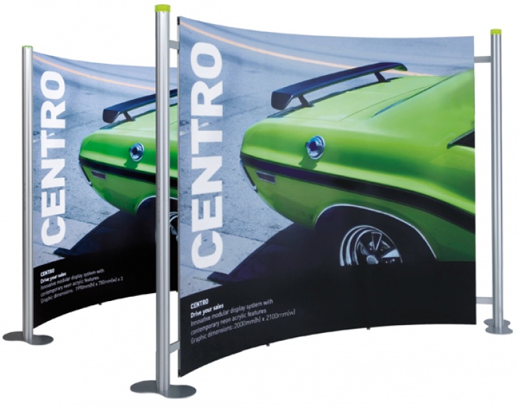 Lichtgewicht eigentijds systeem waar het beeld zowel in textiel- als magneetbaan uitvoering geleverd kan worden. (Centro Magnetic of Centro banner).